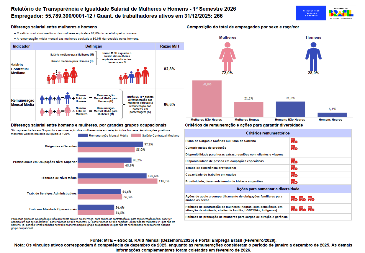O Relatório, segundo o Governo, foi elaborado com base em dados do eSocial de dezembro de 2025, além de informações prestadas pela empresa em fevereiro de 2026 sobre práticas e políticas salariais, remuneratórias e de carreira.